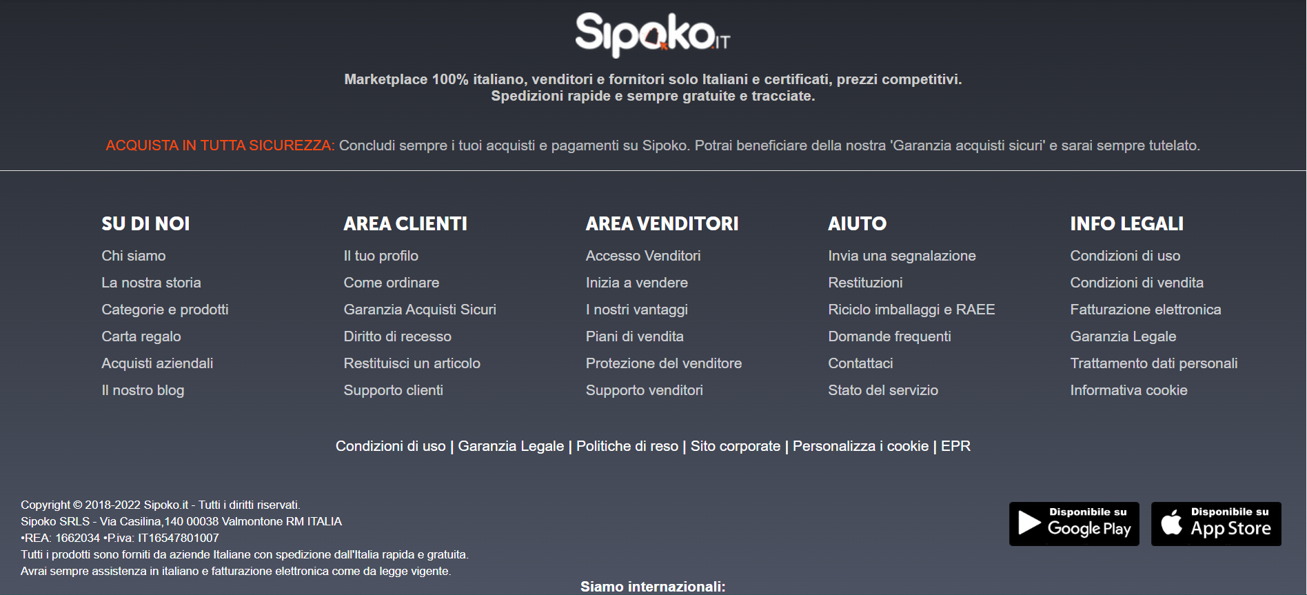 Sipoko is not just another E-commerce website, but a real 'incubator' of Italian companies. Our goal is to create a marketplace made up of only Italian companies, which operate, work, and ship exclusively in Italy by paying taxes to the Italian state.